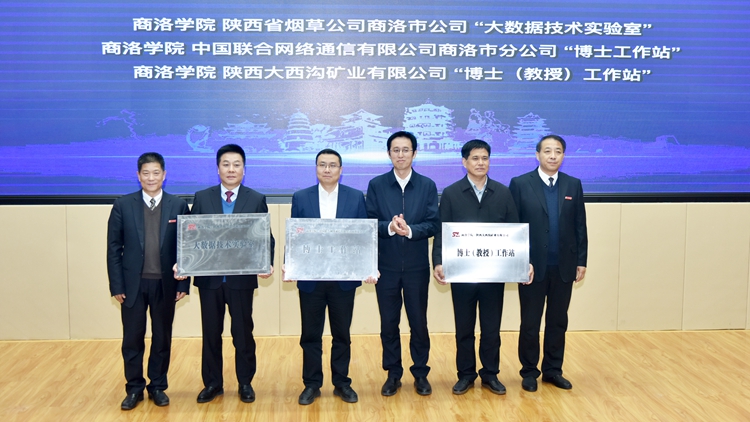 在热烈的掌声中,陈发虎、赵璟为“商洛康养产业研究院”揭牌。孙举恒、张志昌共同为“秦岭商洛生物医药产业知识产权研究中心”、“陕西省知识产权信息公共服务网点”、“商洛学院秦创原创新促进中心工作站”揭牌。孙举恒、范新会、王新军共同为陕西烟草商洛分公司“大数据技术实验室”、中国联通商洛分公司“博士工作站”、大西沟矿业有限公司“博士(教授)工作站”授牌,商洛市烟草局局长洪炜、商洛联通公司总经理李建庆、大西沟矿业有限公司总经理聂建仓代表企业接牌。